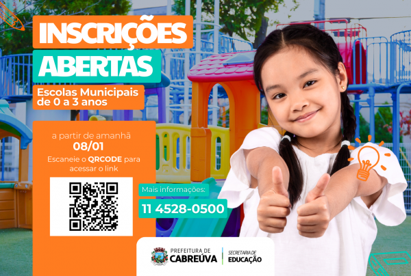 A Prefeitura de Cabreúva abriu o período de inscrições para as creches, que atendem crianças entre zero e três anos. As inscrições podem ser feitas clicando neste link, pelo QR Code na foto que ilustra a reportagem ou também presencialmente. Nesse caso, os responsáveis pelas crianças devem buscar a creche mais próxima de casa.