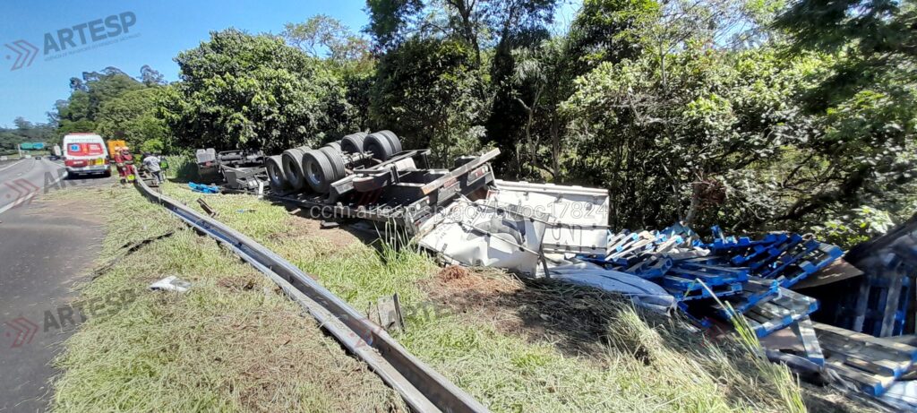 A carga – paletes de madeira – espalhou-se no local. O acidente aconteceu por volta das 10 horas da manhã. O motorista sofreu apenas escoriações. O veículo permanece no local até a publicação desta reportagem.