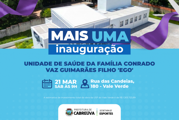 A Prefeitura de Cabreúva marcou para 21 de março (sábado), às 9 horas, a inauguração da nova Unidade de Saúde da Família Conrado Vaz Guimarães Filho (Ego), no Vale Verde.