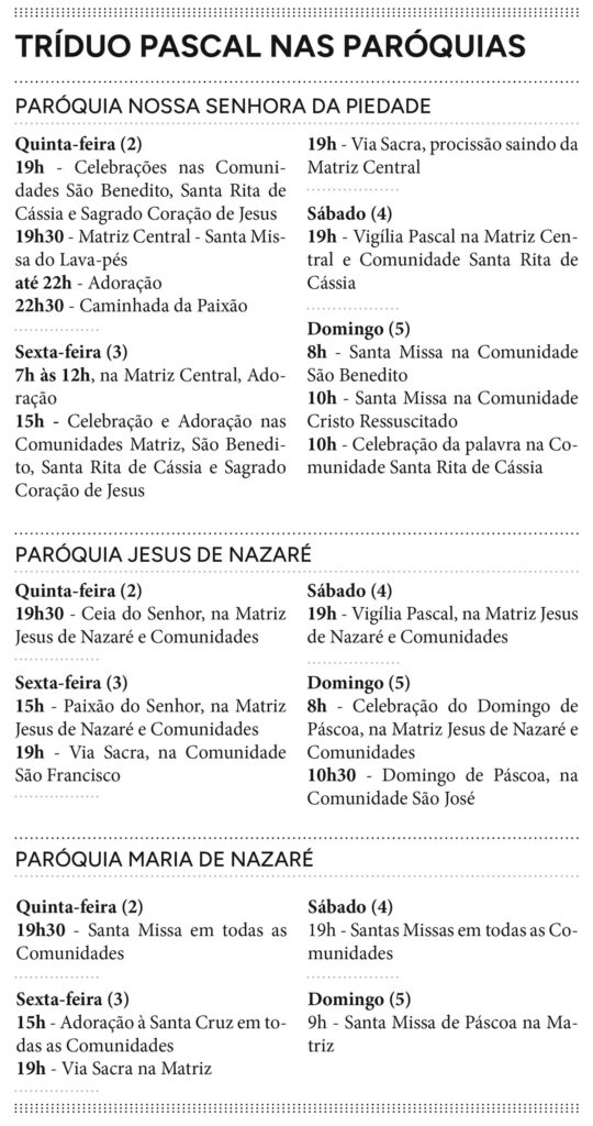 A Sexta-Feira Santa terá Adoração na Matriz (das 7h às 12h, na Sala 28, ao lado da Casa Paroquial) e celebrações nas Comunidades às 15h.
