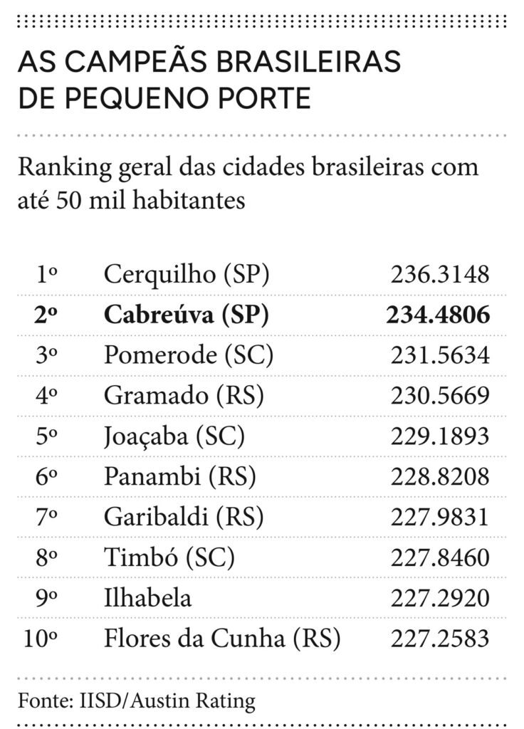 O município de Cabreúva aparece entre os destaques do ranking das melhores cidades do Brasil em 2025. O levantamento foi divulgado pela revista “Veja Negócios”, com base no Índice de Inclusão Social e Digital (IISD), desenvolvido pela consultoria Austin Rating.